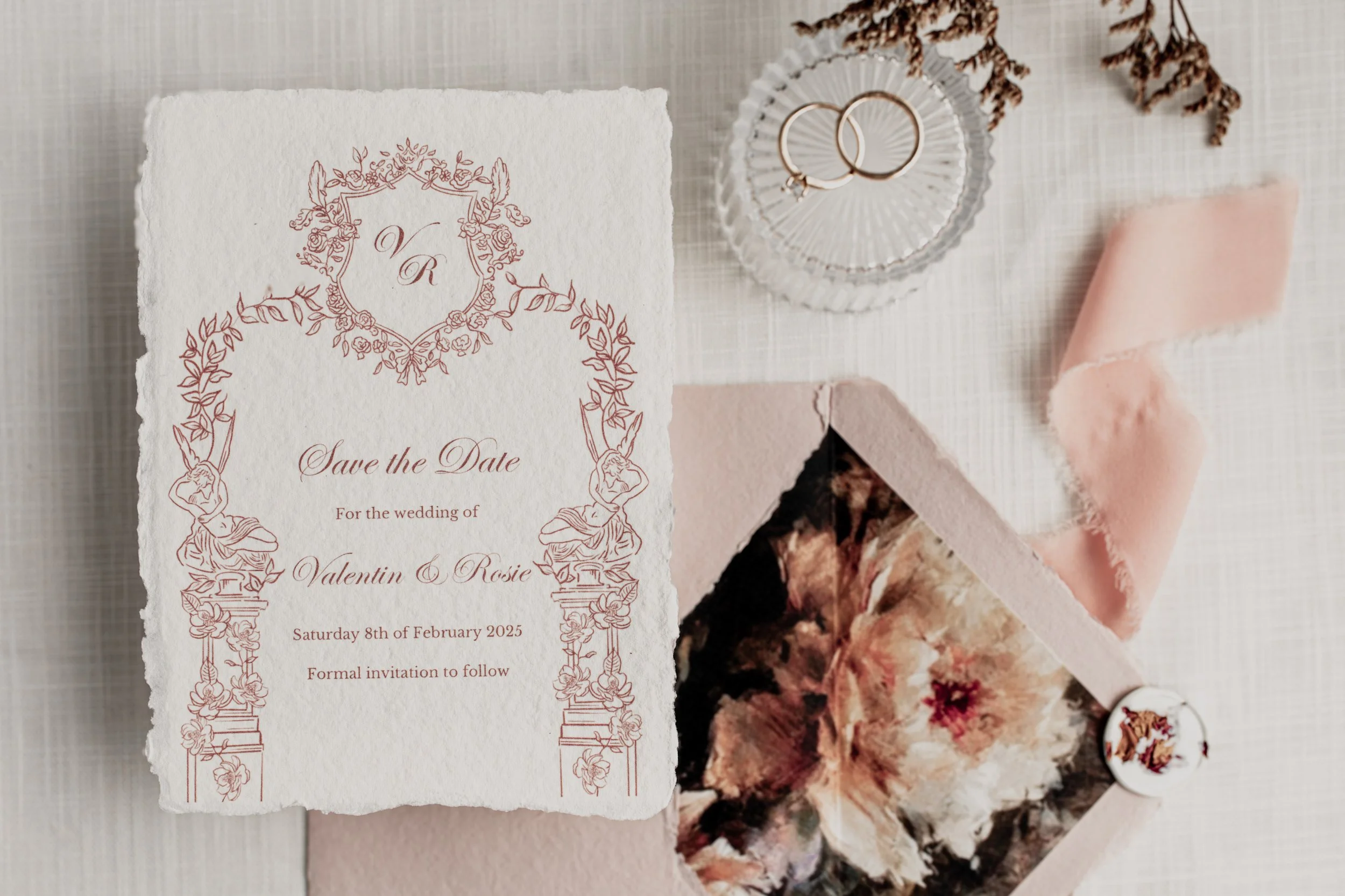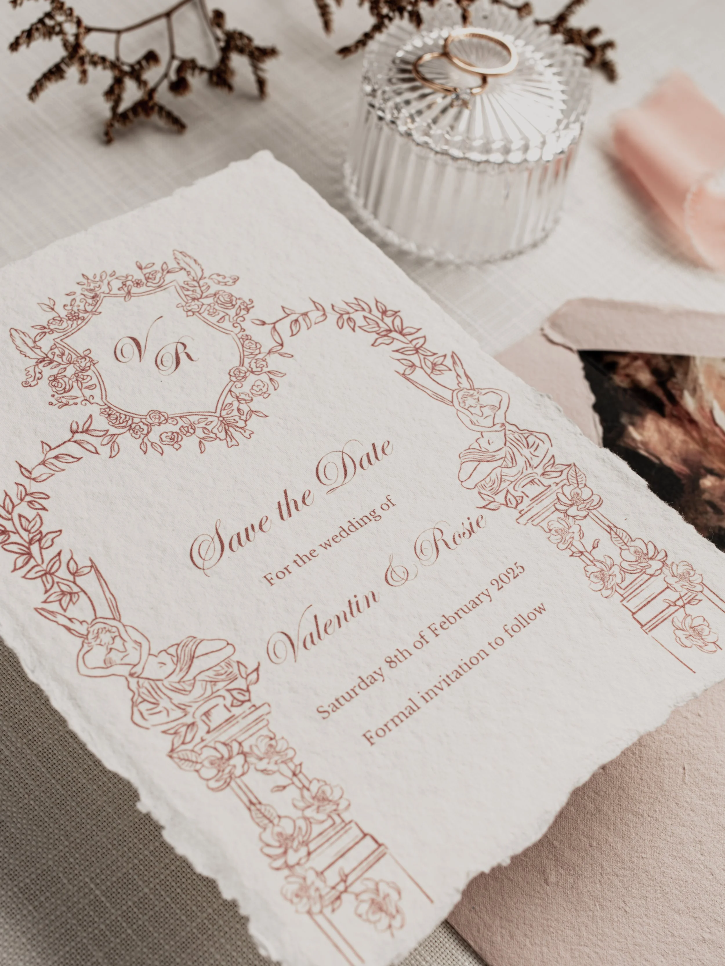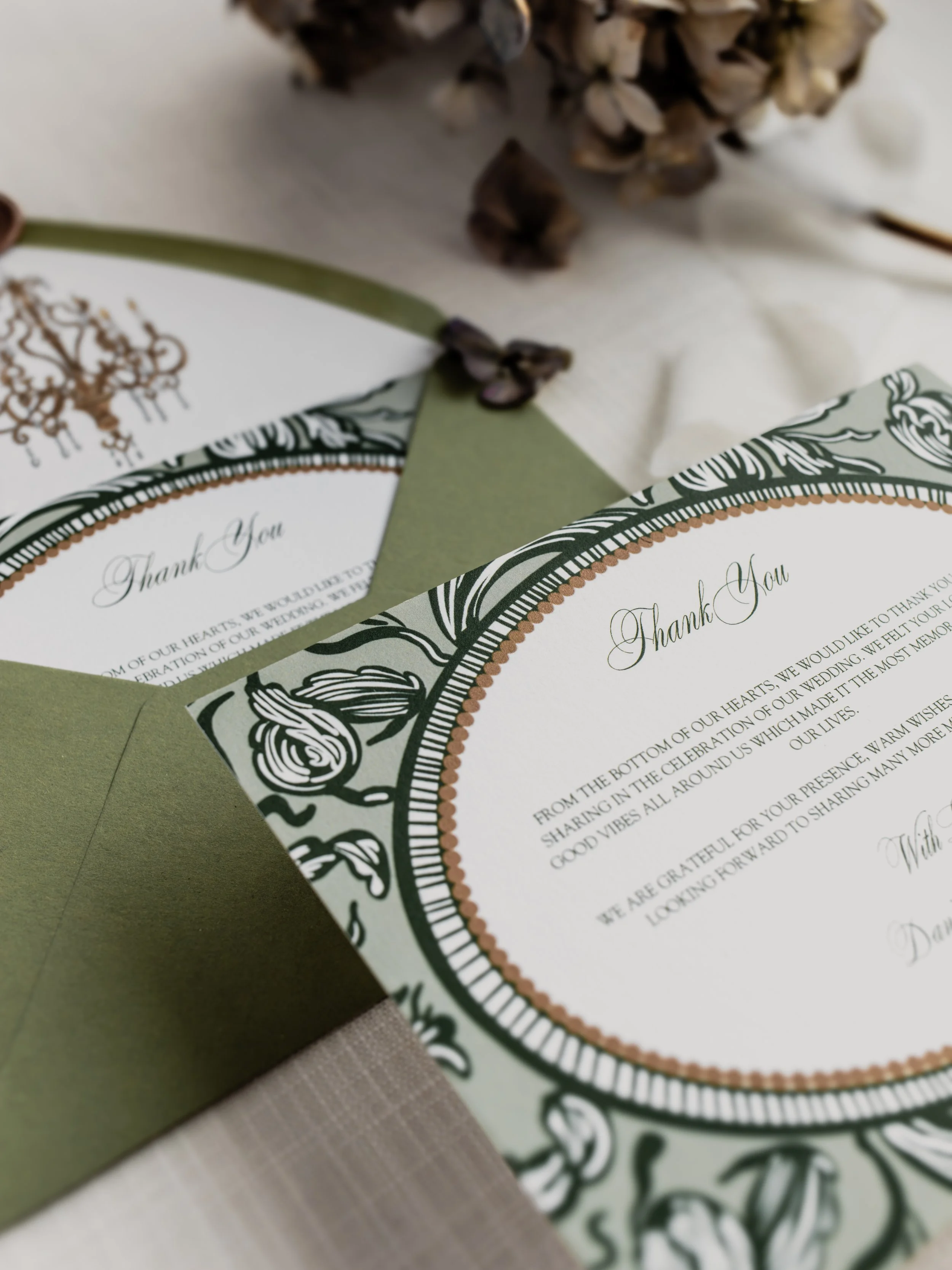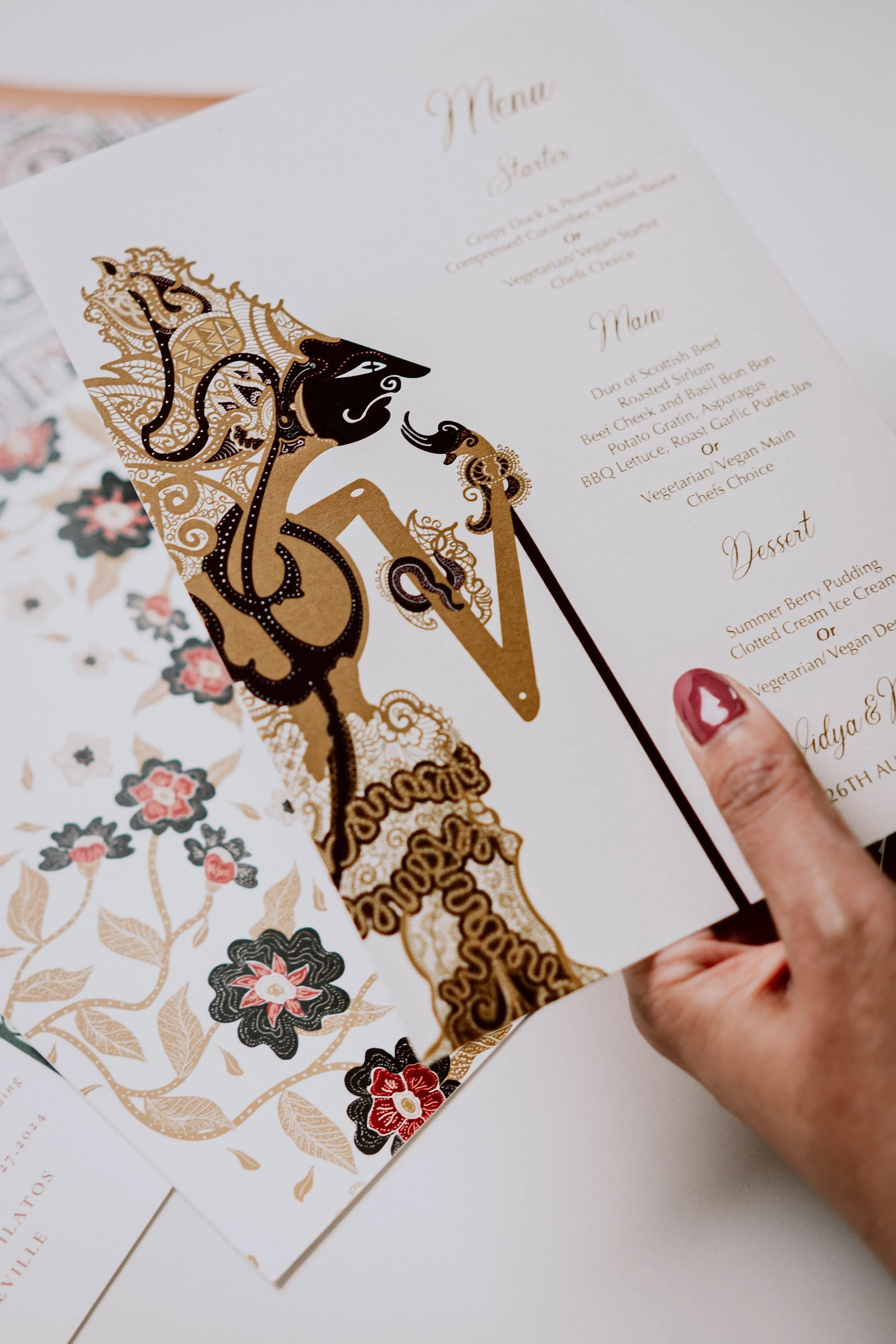 Our designs are printed on premium paper stocks, finished with foil detailing, and bespoke envelopes, offering a truly luxurious touch.