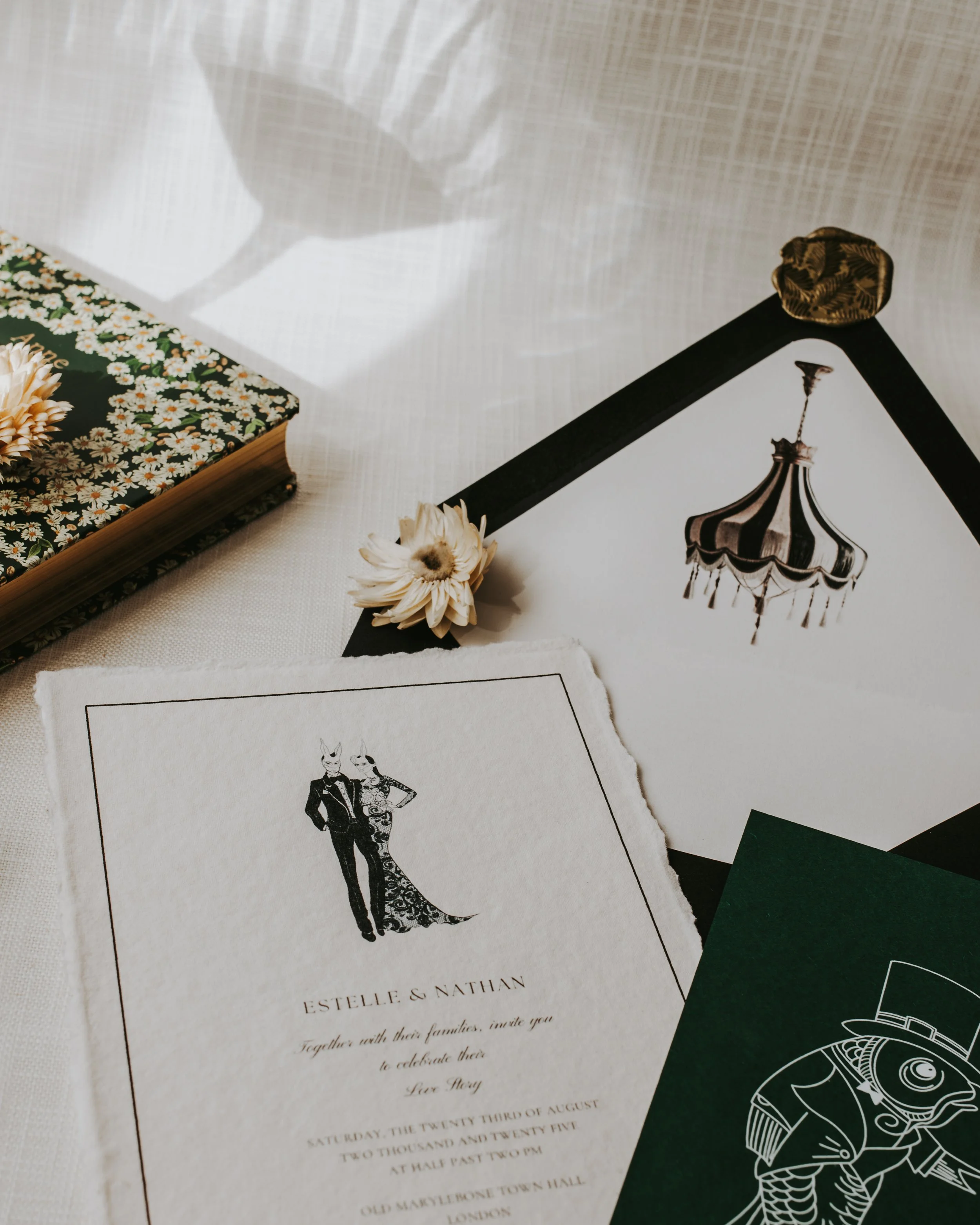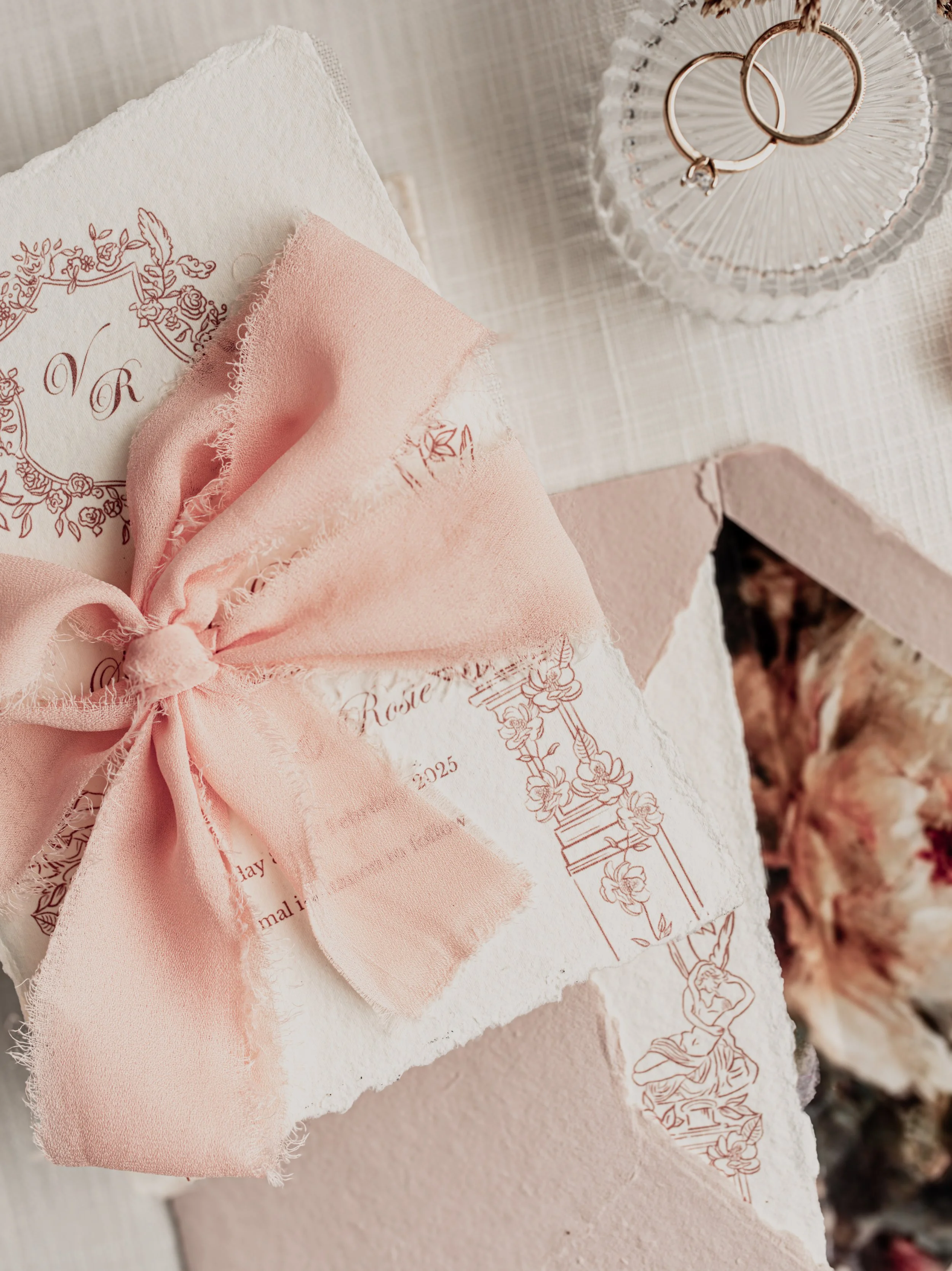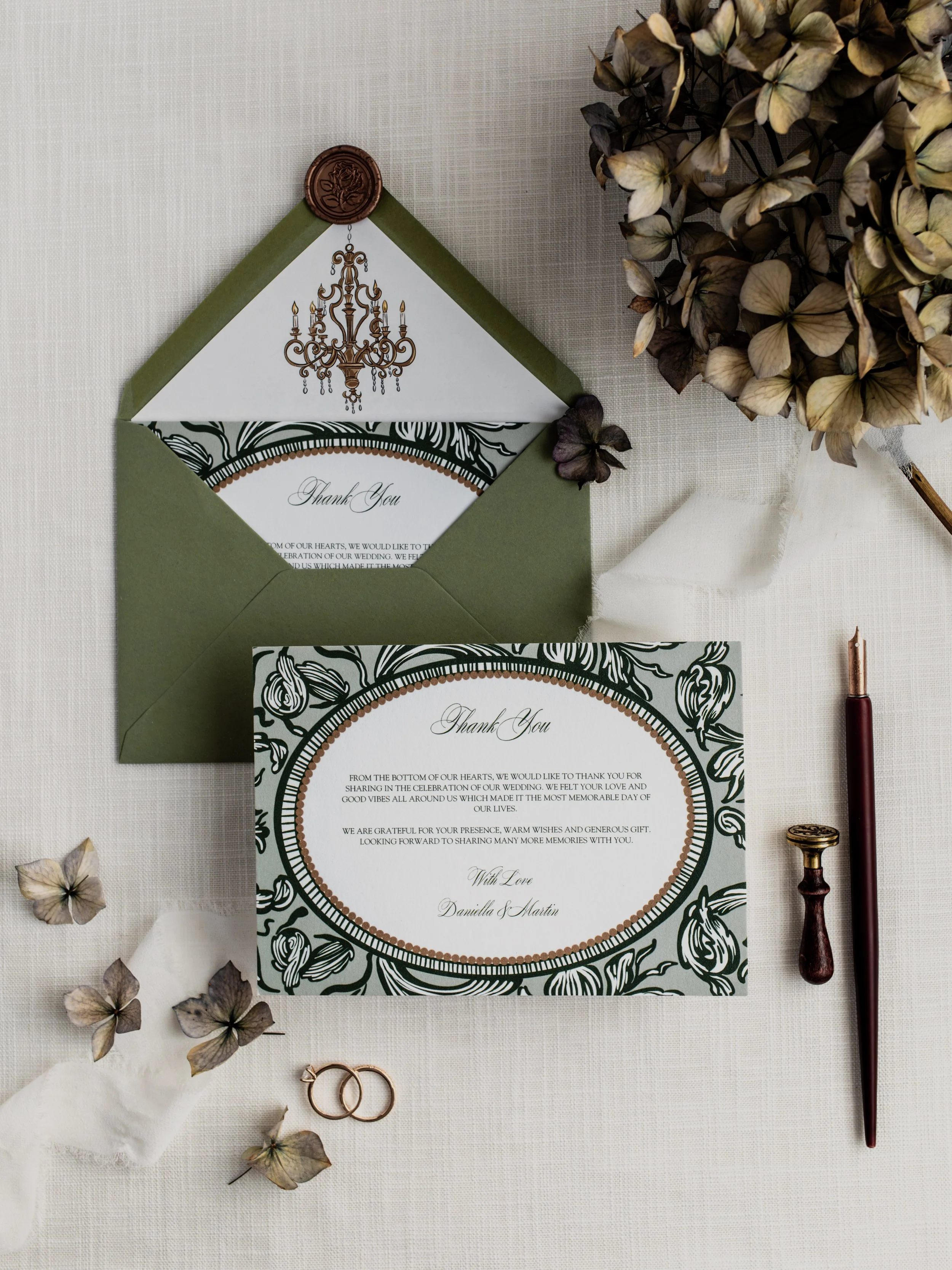 Our designs are printed on premium paper stocks, finished with foil detailing, and bespoke envelopes, offering a truly luxurious touch.